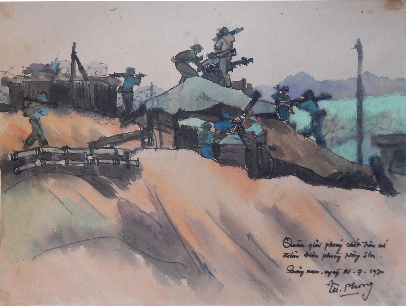 Qua từng đường nét, từng màu sắc, người xem có thể cảm nhận được sự gian khó, thiếu thốn về vật chất nhưng cũng đồng thời nhìn thấy tinh thần thép, ý chí kiên trung và lòng quả cảm ngời sáng của quân dân Việt Nam. Những khoảnh khắc đời thường – một bữa cơm giản dị bên lán trại, một lần nghỉ ngơi hiếm hoi giữa rừng núi hiểm trở, hay những giờ phút căng thẳng trên chiến hào – tất cả đều được tái hiện một cách chân thực và đầy cảm xúc, khiến ký họa không chỉ là nghệ thuật mà còn là chứng tích sống, là lời nhắc nhở về một giai đoạn lịch sử đầy gian lao nhưng cũng vô cùng kiêu hãnh.